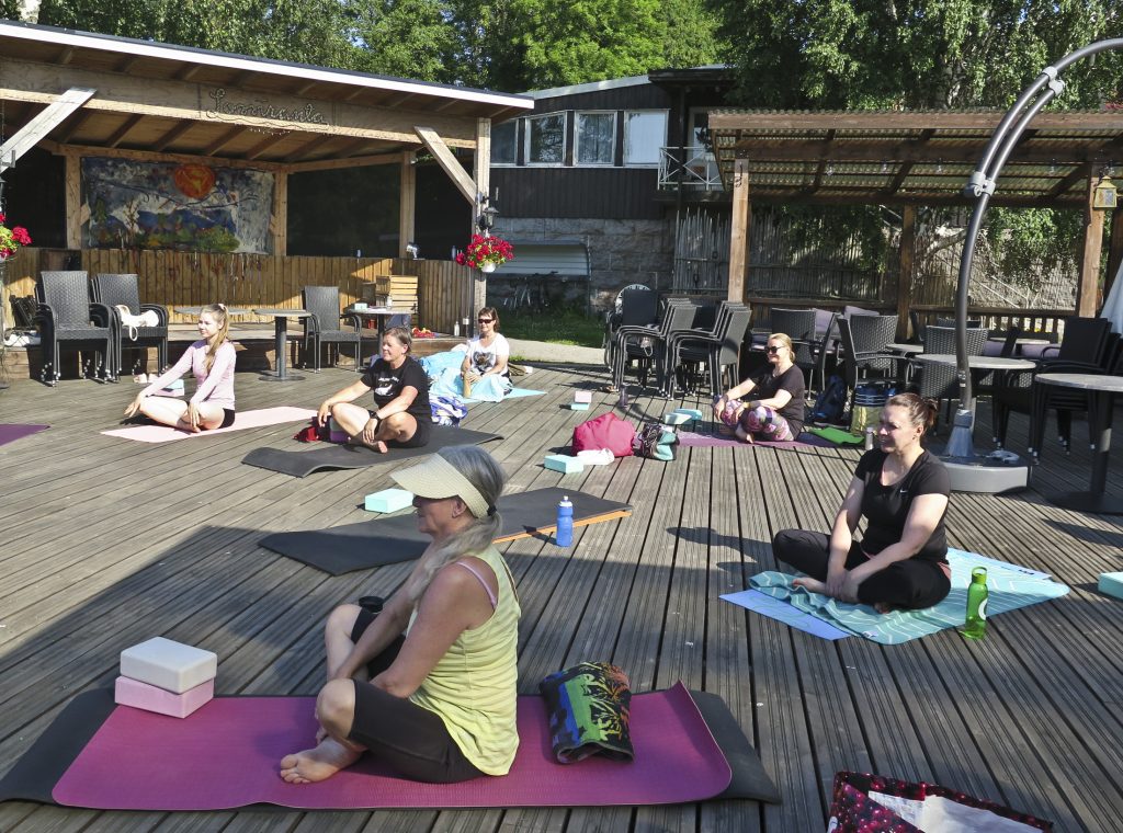 – Osallistun ensimmäistä kertaa terassijoogaan, löysin tämän Facebookista. Harrastan joogaa satunnaisesti, pilatesta enemmänkin. Hangossa olen osallistunut jooga- ja pilatessessioon. Vielä mukavammalta tuntuisi jooga rannalla, mutta Förby on Paimiosta katsottuna aika kaukana. Olen rakentanut tästä elämyspäivän itselleni, menen Kokkilan rannalle uimaan joogan jälkeen.