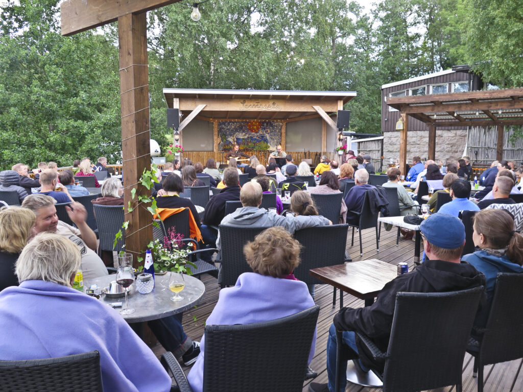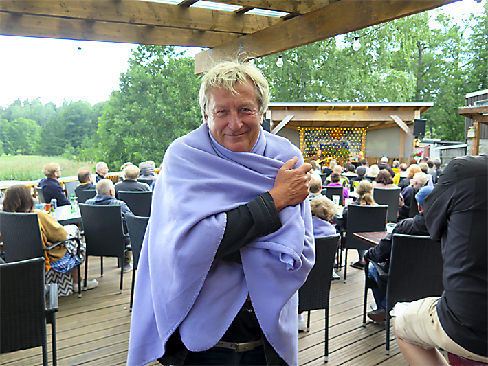 Yleisöä on illan keikalle tosiaankin tullut terassin täydeltä. Tulevien tapahtumien varalle yleisön kannattaa huomioida, että esiintymislava on ulkona ja iltaisin voi kesälläkin olla viileää. Shortseihin pukeutunut nuorimies käy kysymässä vilttiä, mutta niitäkään ei ihan jokaiselle kuulijalle riitä.