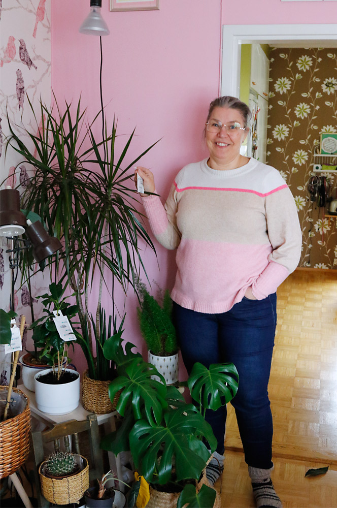 Wilhelmiinan ja hänen nelilapsisen perheensä kodissa on puutarhan lisäksi 65 erilaista viherkasvia. Niitten oksilla riippuu pieniä pusseja.