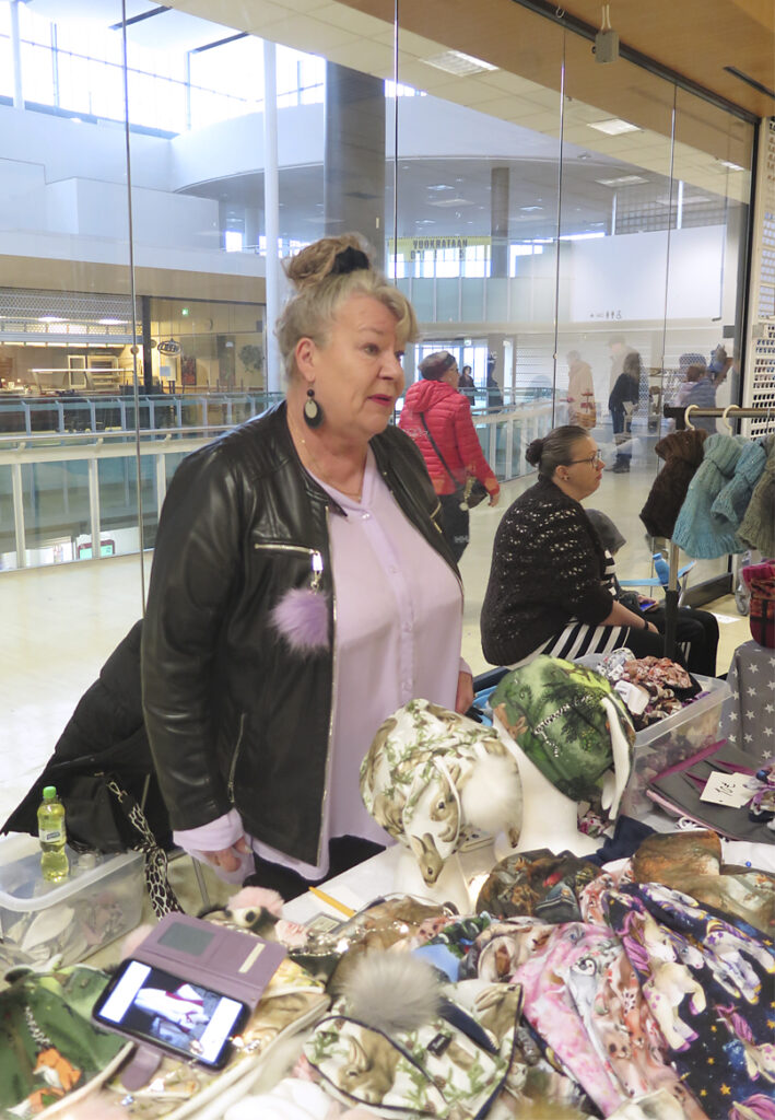 – Minulla on kotona kauneushoitola, ja yrittäjänä olen toiminut vuodesta 1985, alun perin myytiin työvaatteita. Nämä pipot ovat sivutuotteita, joitten kanssa kierrän joulun aikaan myyjäisiä. Käytän mielelläni suomalaisten suunnittelijoitten, kuten Mainelakeuksen kankaita. Pupun korvilla varustetut pipot ovat ihan oma innovaationi ja näitä saa myös aikuisten koossa. Yksi miespuolinen asiakkaani käyttää korvallista pipoa jänismetsällä.