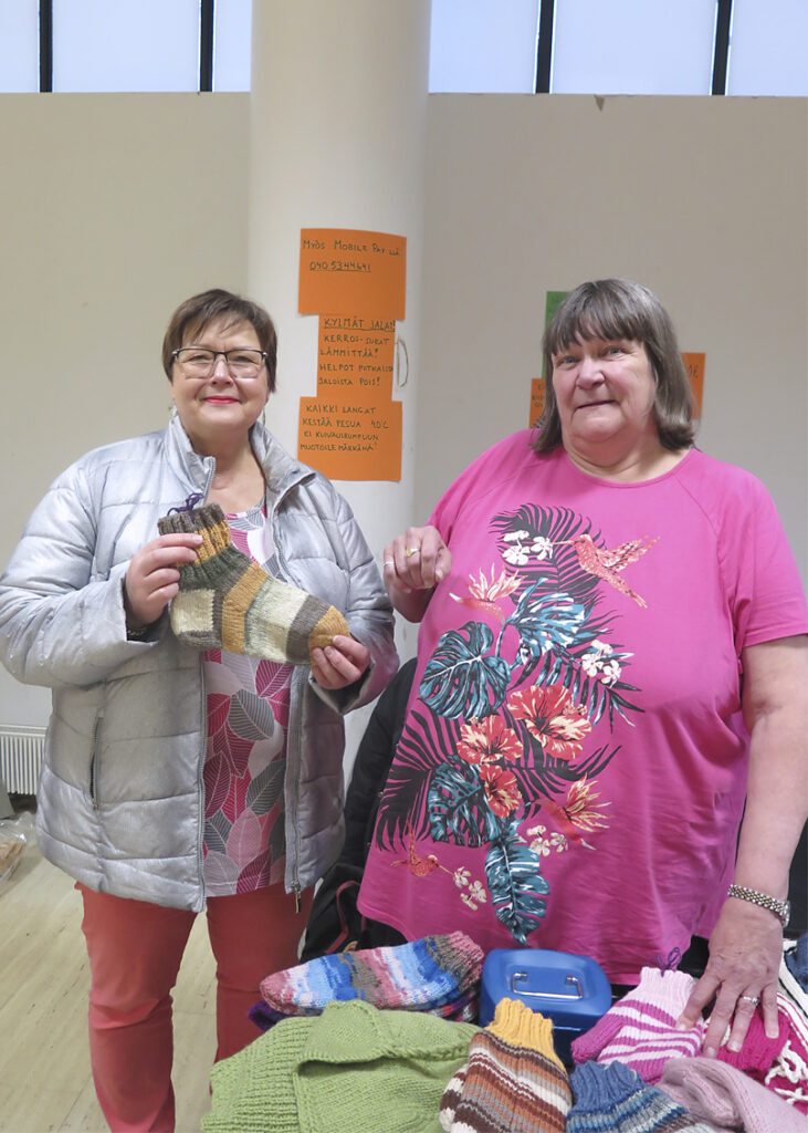 – Huvin vuoksi näitä kudon, päivisin, iltaisin ja öisin! Nämä ovat vasta toiset myyjäiset, joihin osallistun ja heti sain kanta-asiakkaan: yksi osti Myllyojankadun markkinoilta sukat ja nyt hän tuli ostamaan lapaset, kertoilee Tiina iloisesti ja toteaa vielä kuvaa otettaessa: ”Mä olen maailmankuulu Salossa kohta!”