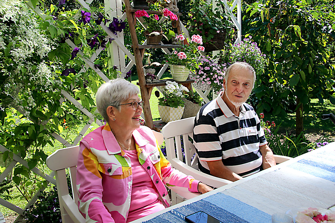Kun kysyn, valmistuuko puutarha koskaan, niin ainakaan uusia lajikkeita ei mahdollisesti enää puutarhaan istuteta. Tosin, ei voi koskaan tietää, mikä upeus jossain osuu silmään, kun liikkuu. Lopuksi he molemmat mainitsevat koko puutarhan suosikki kohdaksi sisäänkäynnin alueen.