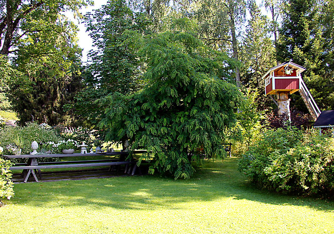 Pöytäryhmän läheisyydessä on hauskasti ideoitu lasten puumaja, joka on rakennettu vanhan kuusen kannon päälle lähes neljän metrin korkeuteen, johon lastenlapsilla helppo kulku rappusia pitkin ihastelemaan maisemia.