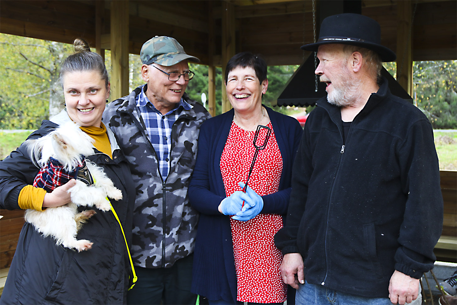 Tyytyväiset talkoolaiset. Suomusjärvi-Seuran hallituksen jäsenet Mari-Anne Mielikäinen, Kalervo Mäkinen, Riitta Laine ja Veikko Karvinen olivat mukana avaamassa uuden grillikatoksen käyttöön makkaranpaiston kera.