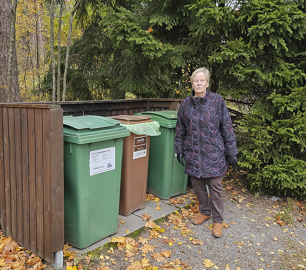 Kuuden asunnon rivitalossa asuva Marjatta Hyttinen kertoo, että taloyhtiön roskakatokseen hankittiin biojäteastia noin vuosi sitten.