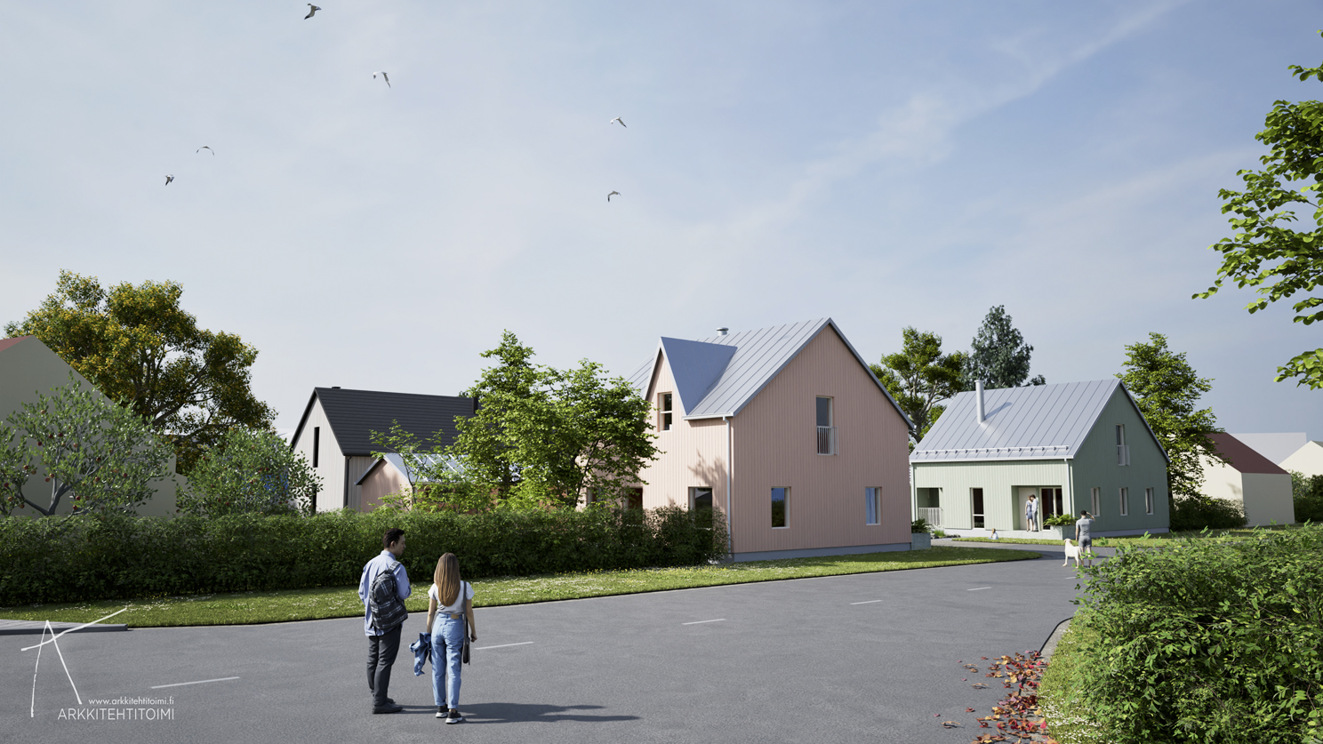 -Alueesta on laadittu havainnekuvat, jotka antavat ensivaikutelman tulevasta pientalovaltaisesta kokonaisuudesta.