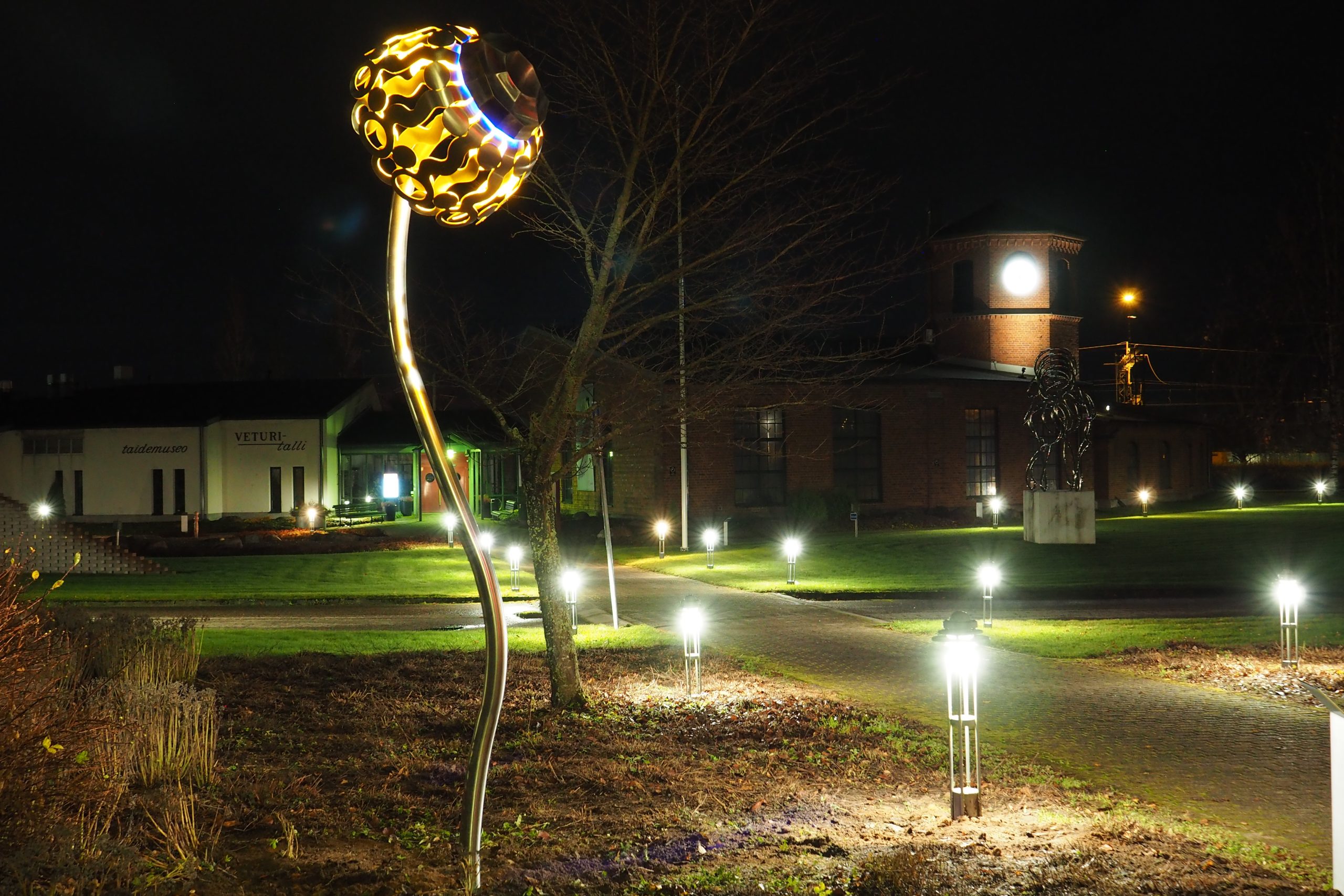 – Veturitallin Mariankadun puoleinen piha-alue on merkittävä osa museon miljöötä. Hoidettu piha-alue yhdessä ulkoveistosten kanssa luo vetovoimaa koko kaupungille, sillä alue sijaitsee keskeisen kulkureitin varrella Salon keskusta-alueella. Korkeatasoisilla julkisilla veistoksilla tehdään kiinnostavia, mutta myös turvallisia ympäristöjä: Lehtisen teos valaisee pihan kulmausta ja kukan valaistus kytketään pihan muun valaisun rytmiin, Veturitallilta kommentoidaan.