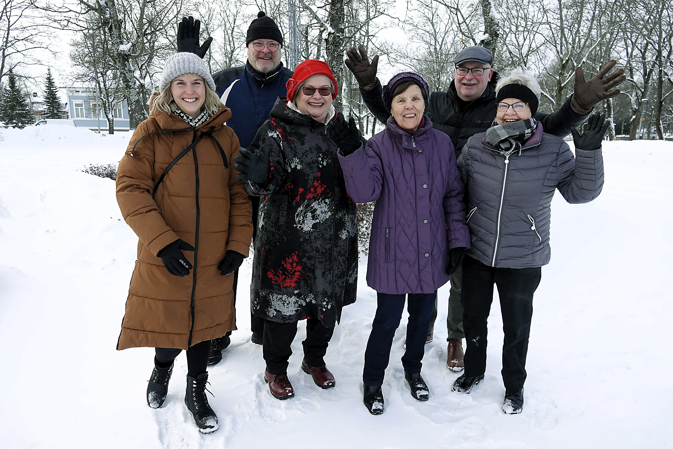 Kuvassa Eeva Saarikivi-Kavander (vas.), Mia Blomqvist, Ritva Jalonen ja Ritva Suominen sekä takana Hannu Lukkarinen (vas.) ja Jukka Jakobsson.