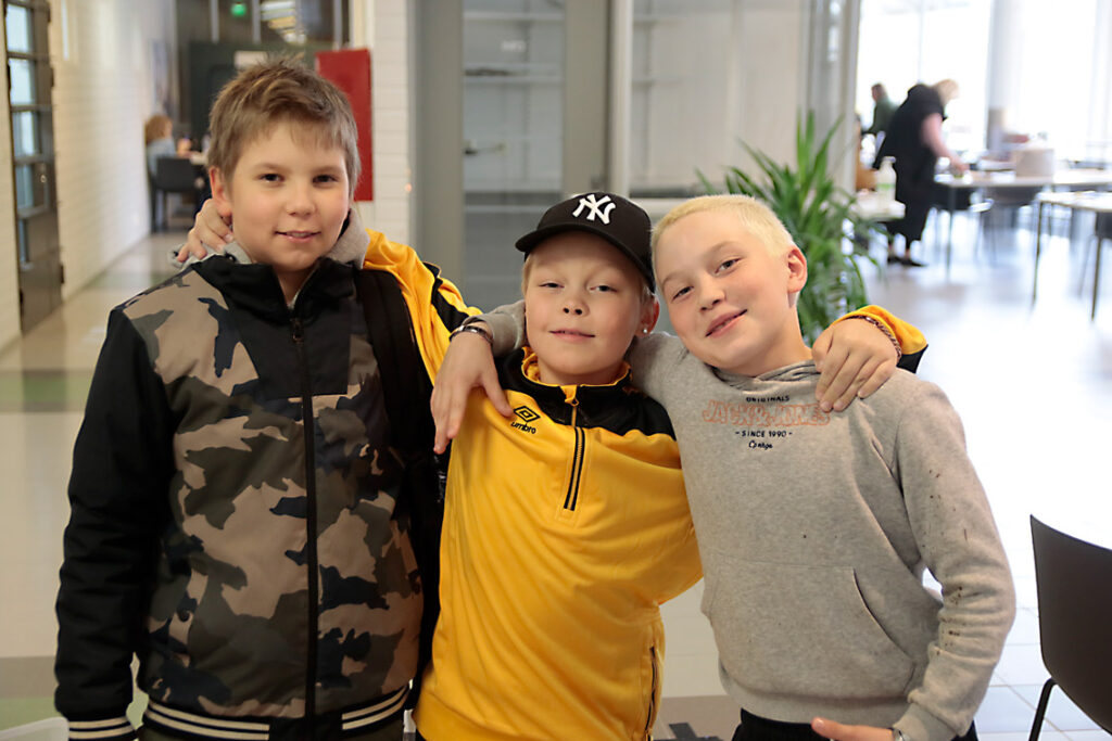 Kaverukset Rene, Ami ja Atte komppaavat Alexia. Liikuntahallilla aika on kulunut rattoisasti.
