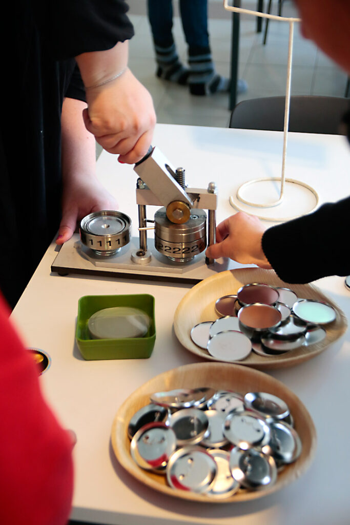 -Tässä on erilaisia lehtiä, vanhoja julisteita sun muita, joista voi leikellä haluamansa näköisen, ja sitten pinssikoneella tehdään itse rintanappi.