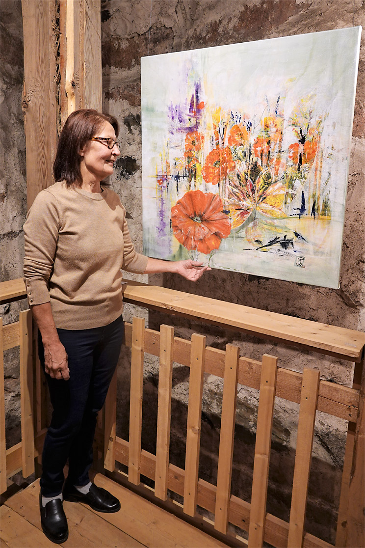 Seewaldilla on Kiskon Kivimakasiinissa esillä useampia, erikokoisia kukka-aiheisia maalauksia.