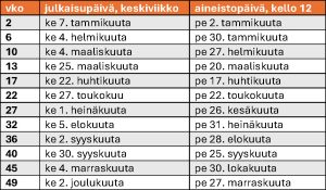 Julkaisuajankohdat 2026 (suurenna klikkaamalla kuvaa)
